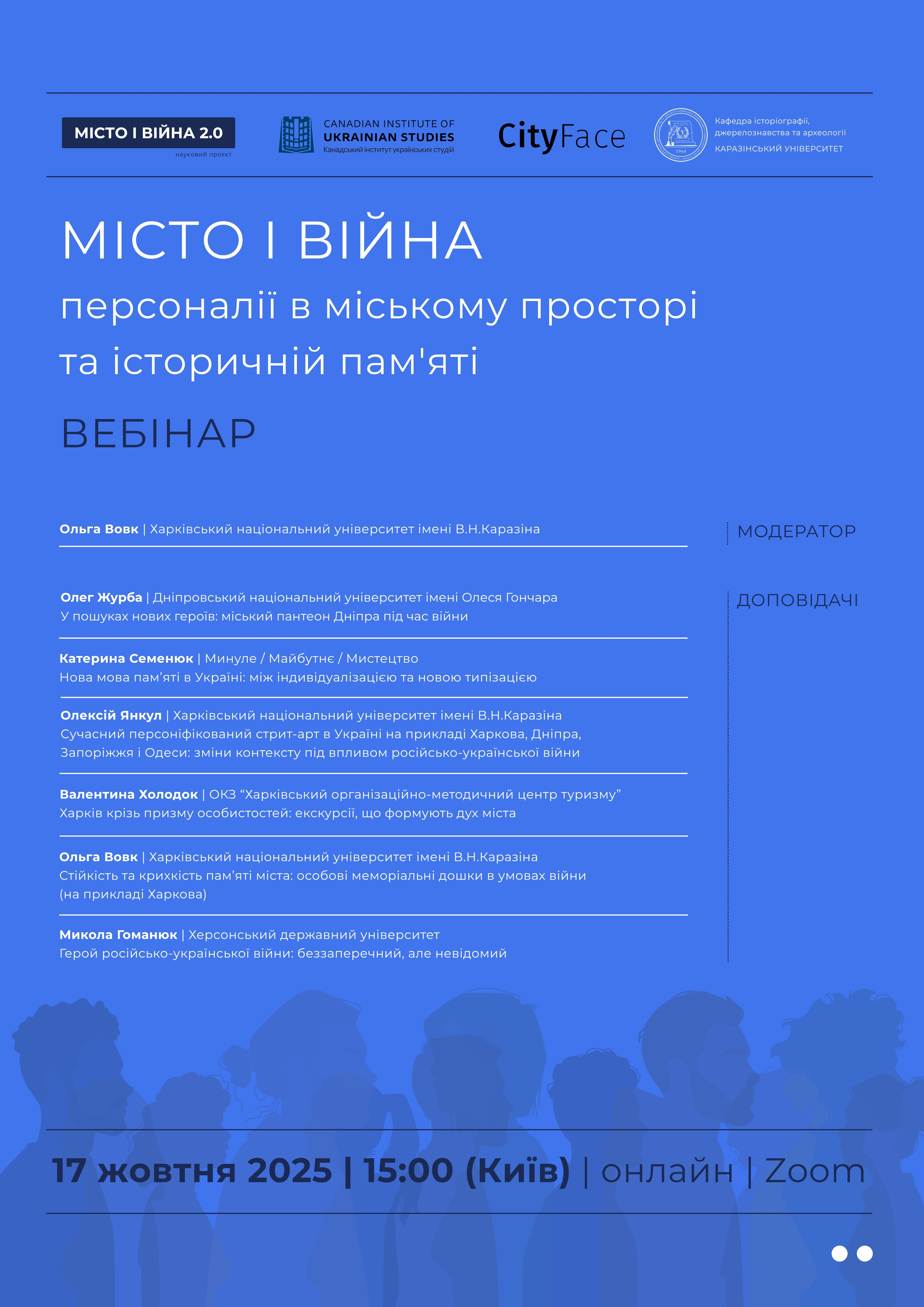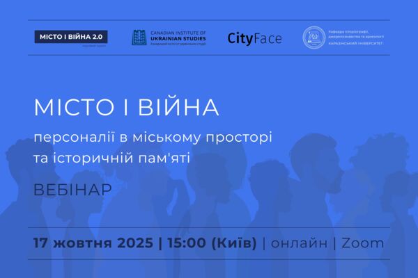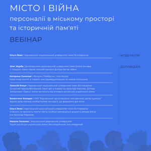 Запрошуємо на черговий вебінар – “МІСТО І ВІЙНА: персоналії в міському просторі та історичній пам'яті”, що відбудеться в межах проєкту “МІСТО І ВІЙНА 2.0”.
