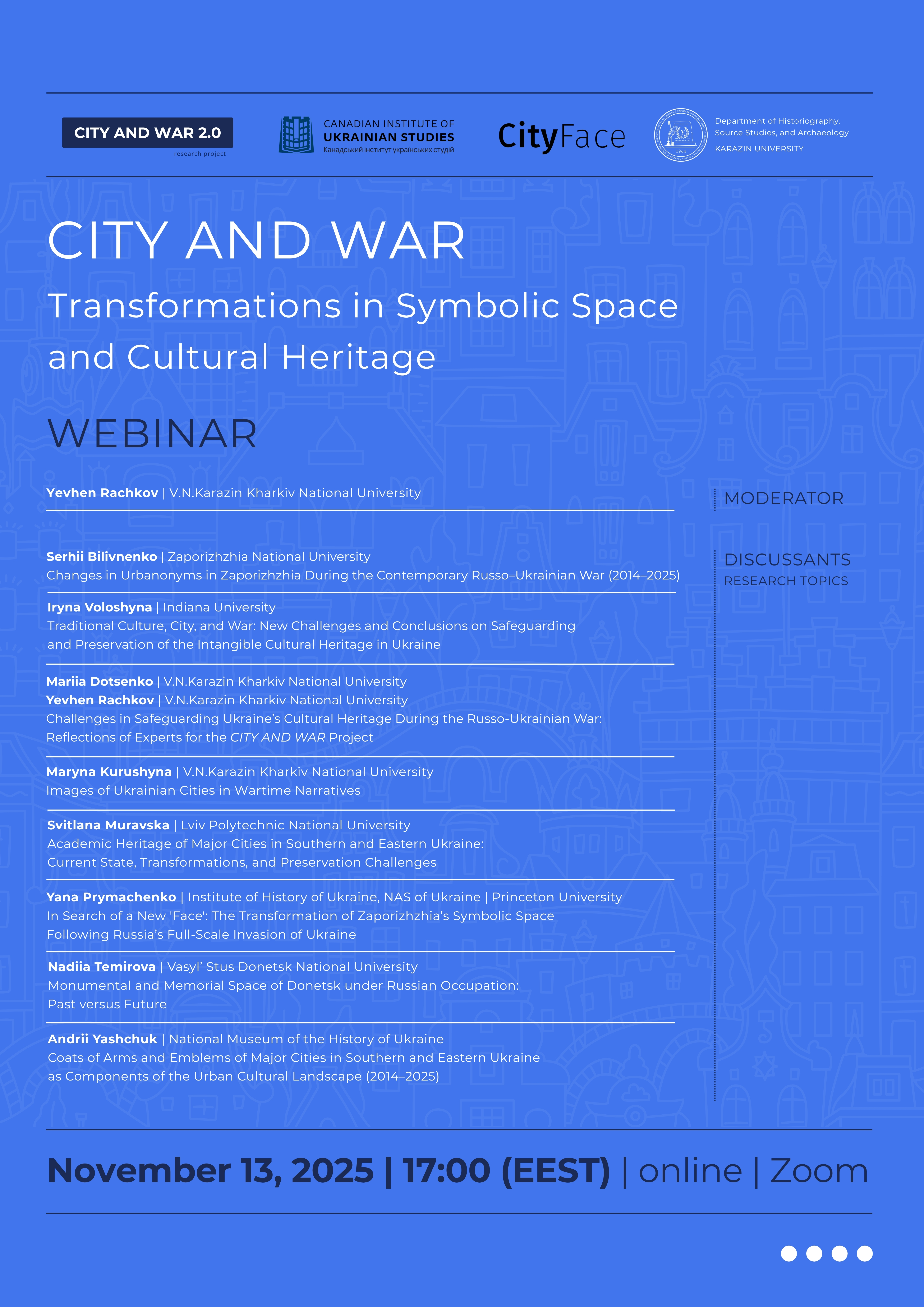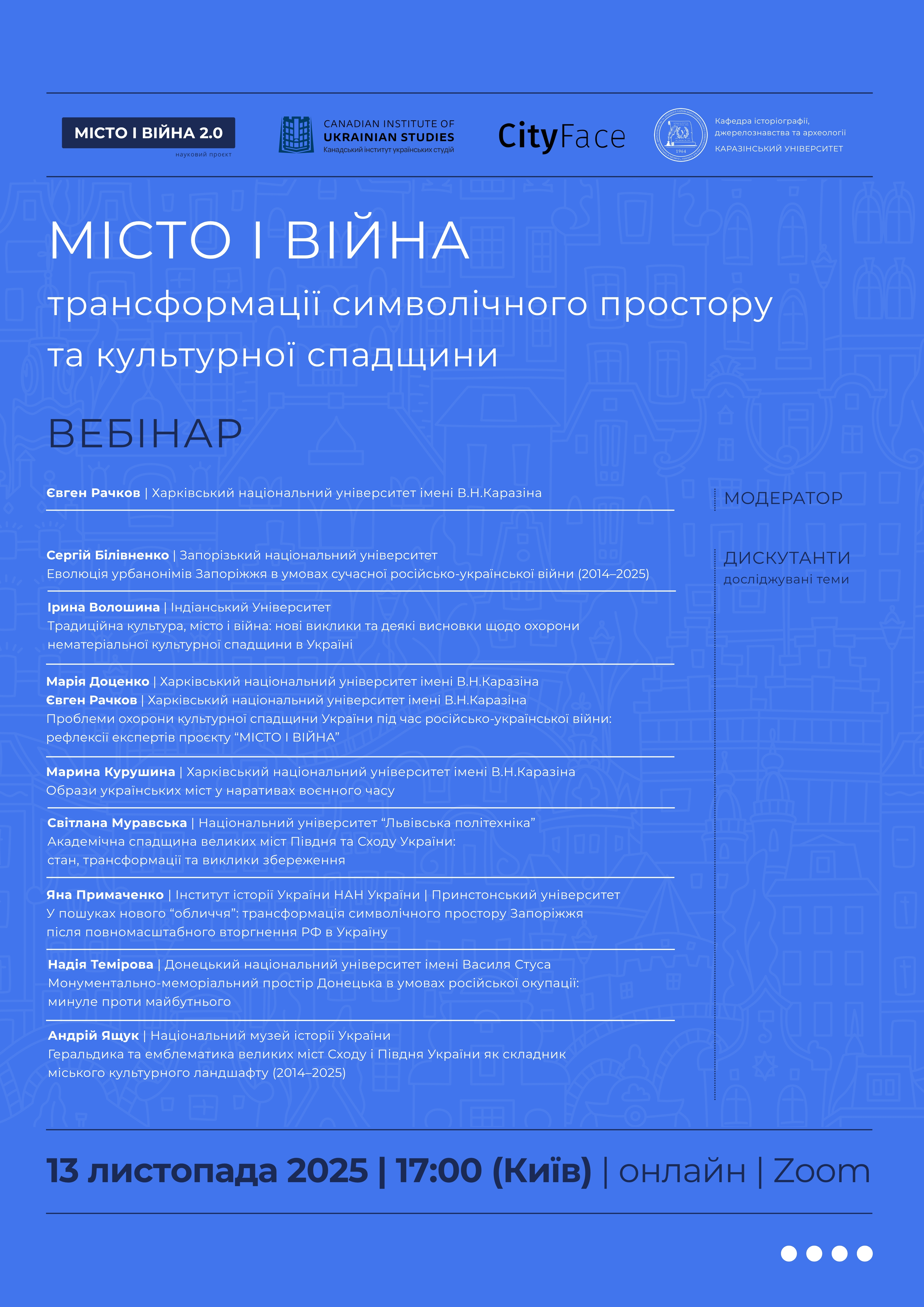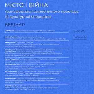 Запрошуємо на черговий вебінар – “МІСТО І ВІЙНА: трансформації символічного простору та культурної спадщини”, що відбудеться в межах проєкту “МІСТО І ВІЙНА 2.0”.