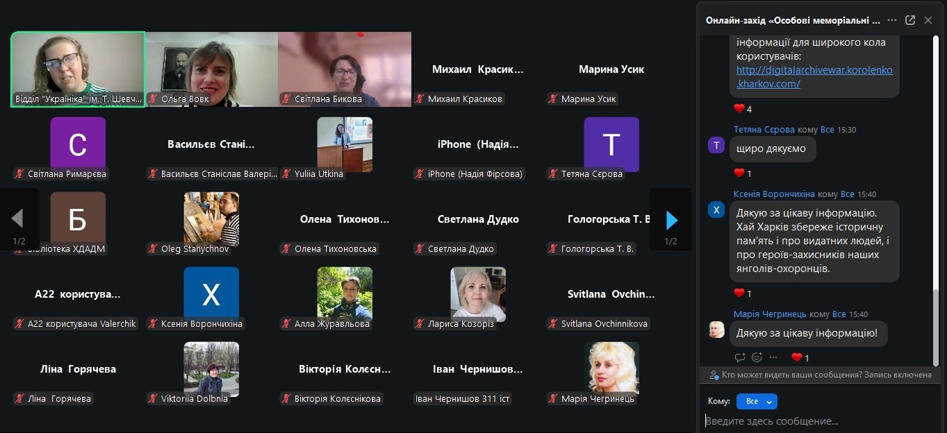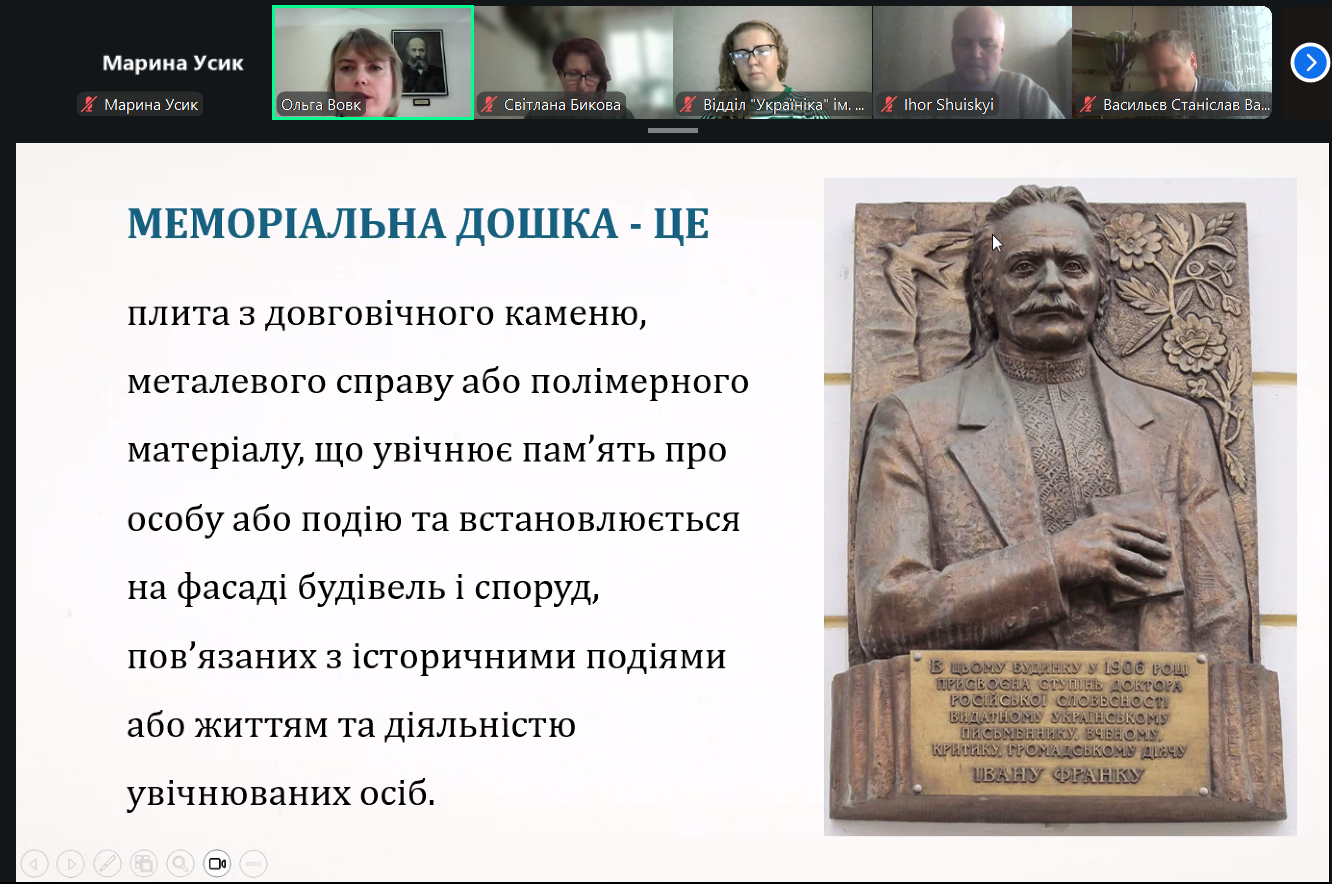 Під час заходу вона виголосила доповідь “Особові меморіальні дошки у соціокультурному просторі Харкова”.